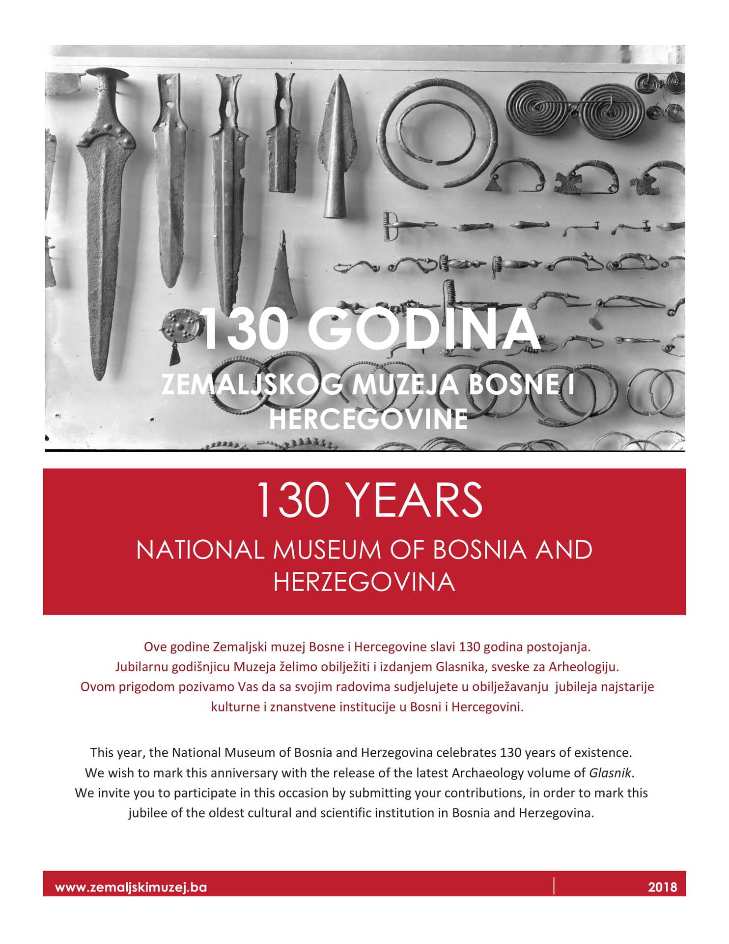 This year, the National Museum of Bosnia and Herzegovina celebrates 130 years of existence. We wish to mark this anniversary with the release of the latest Archaeology volume of Glasnik. We invite you to participate in this occasion by submitting your contributions, in order to mark this jubilee of the oldest cultural and scientific institution in Bosnia and Hercegovina.